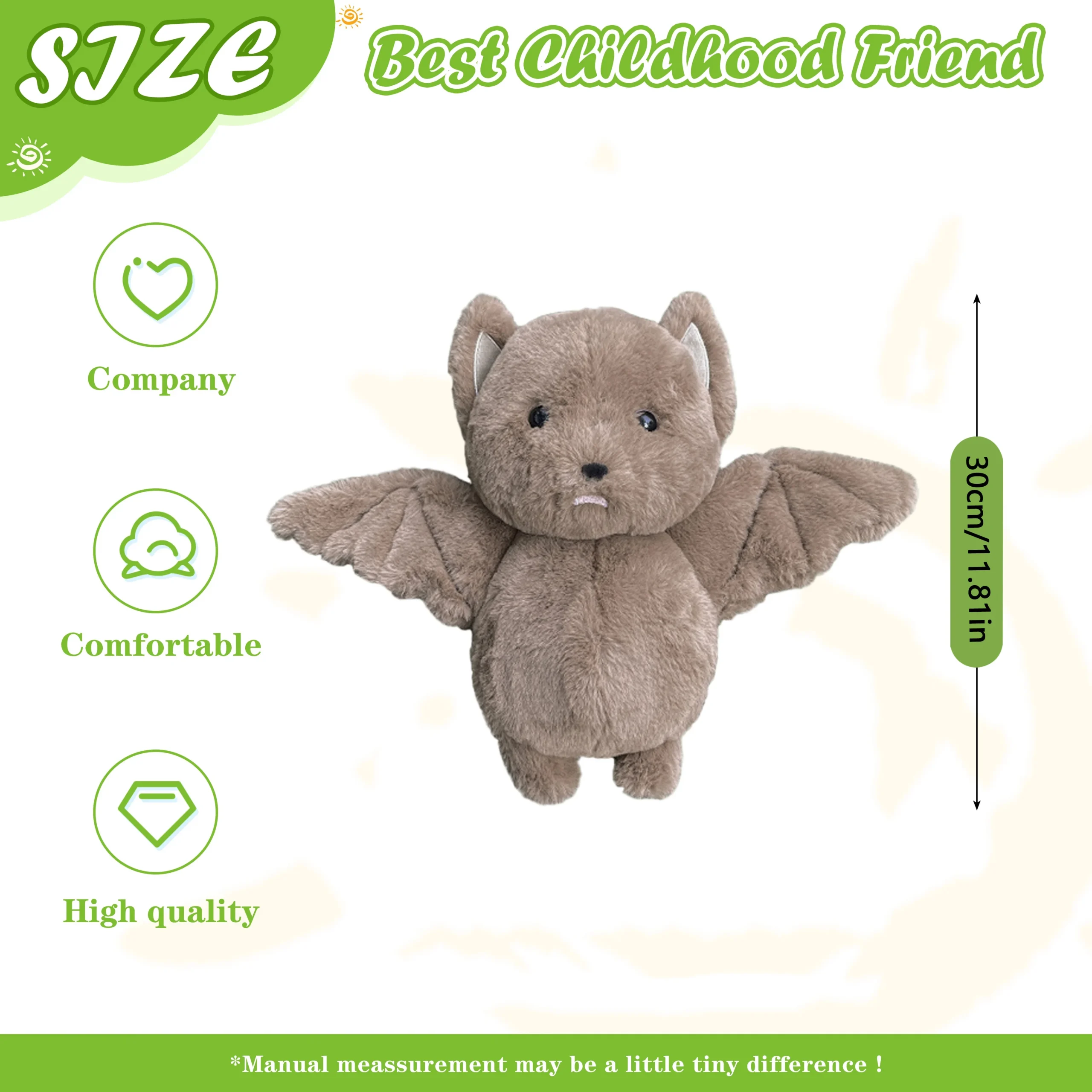 Big, fluffy, and soft! I bought this, not really understanding how big 30cm was, and was wildly surprised when this humungous bat plush arrived! In the photos i compared its size to a handheld fan, a switch charger, and my 20 lbs cat. Very nice!