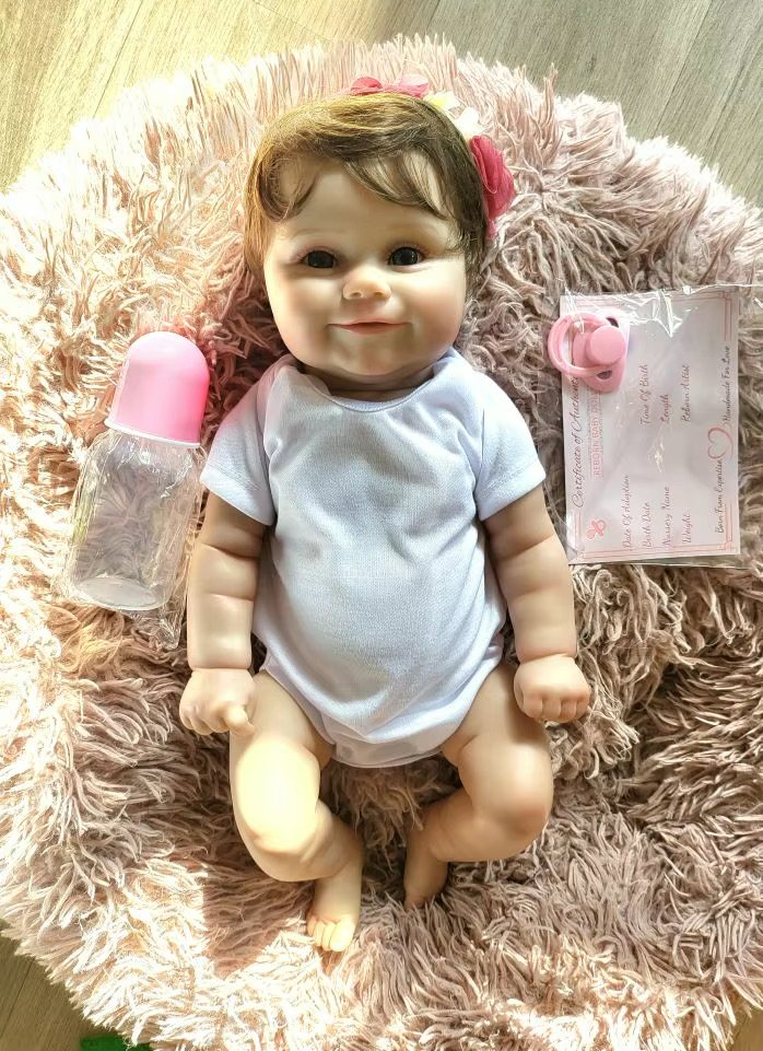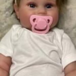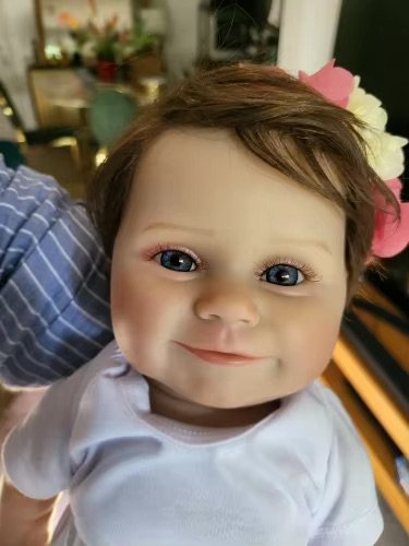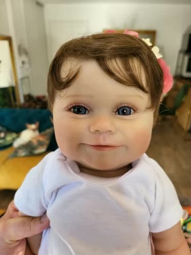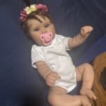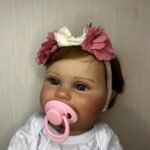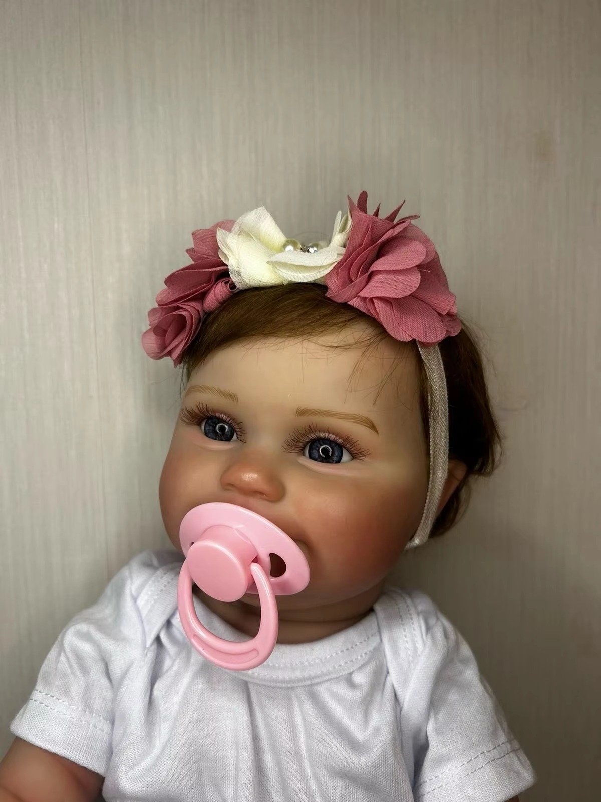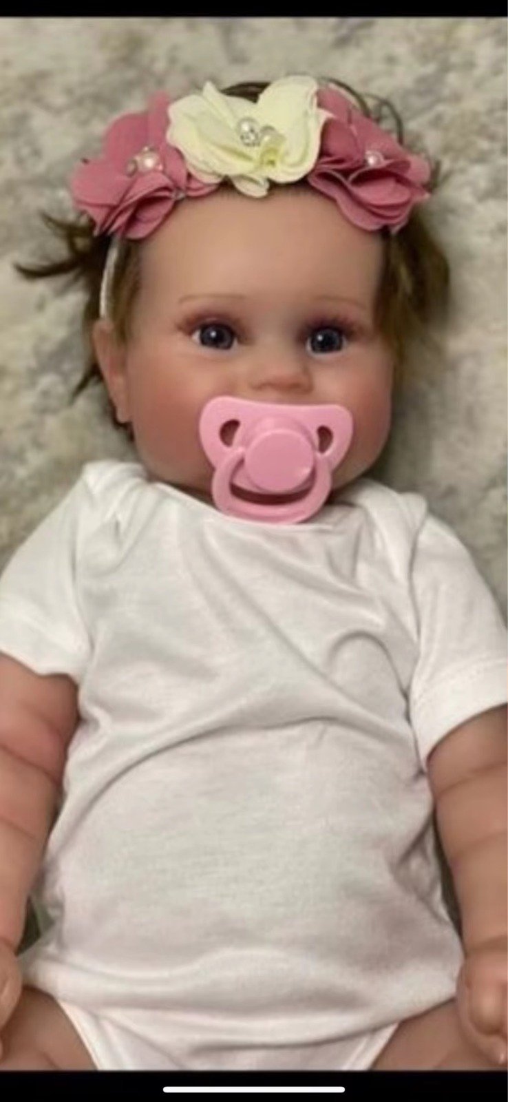 She comes dressed in a cozy onesie with a beautiful floral headband and a matching pacifier — perfect for cuddling, display, or gifting. Each detail, from her rosy cheeks to her tiny fingers, makes her a heartwarming addition for collectors, children, or anyone who loves lifelike baby dolls.